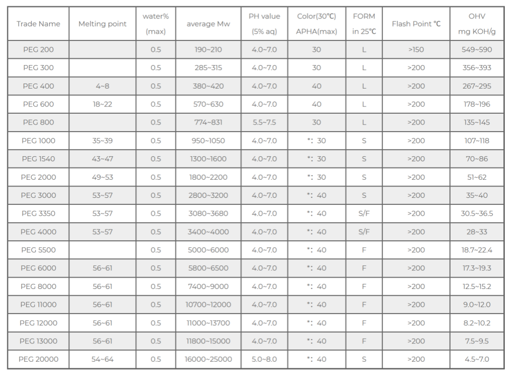 PEG-200 ~ PEG-600: 저분자량, 액체. 점도가 낮고 수용성이 우수하여 우수한 용제, 가소제, 보습제로 널리 사용되며 화장품 및 의약품 액제에 널리 적용됩니다.
